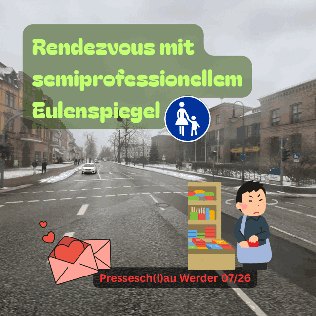 Pressesch(l)au Werder, digitales Wochenjournal der aktuellen Netzmeldungen zum Thema Blütenstadt. Ausgabe 160 (KW07/26) unter anderem mit: Fußwegschildern, lokaler Kunst, reichlich Diebsvolk, Neuem von der zukünftigen Großbaustelle Thermenumfeld und schwankenden Möbeln.